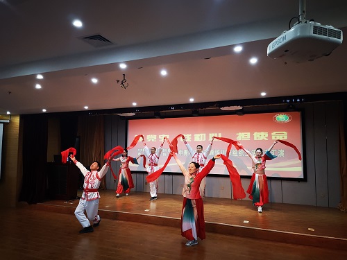 诗朗诵《红色七月 星耀中国》拉开了文艺表演晚会的序幕,第一组10位学员铿锵有力的诵读声,让我们回忆起了1921年中国共产党成立时的惊险激荡、波诡云谲;金平安表演的手帕秧歌舞让我们想起了延安老区的革命者,他们自力更生、艰苦奋斗,用不断开拓创新的精神创造美好生活;王彩绒的秦腔清唱——《三滴血》选段《祖籍陕西韩城县》,唱腔百转回合,曲调高昂却处处悲恸,主人公的哭诉直击每个人的内心最深处;“越来越好”的红绸舞,展现了在党中央领导下中国人民的幸福生活景象;王建国的男声独唱《红星照我去战斗》向党和国家、人民展现了当代青年人的坚定担当;樊恒辉的太极拳表演柔中化刚、极富变化、魅力无穷;第三组学员合唱诗朗诵《红船,从南湖启航》描摹了建党之初的动人画面;冯浩的说唱幽默风趣;第二组学员诵读《鲜红的党旗永不褪色》和全体学员老师气势磅礴的合唱《没有共产党就没有新中国》、《歌唱祖国》,展现了中国共产党的辉煌历史、骄人傲绩,中国人民永远热爱祖国、守卫祖国。
